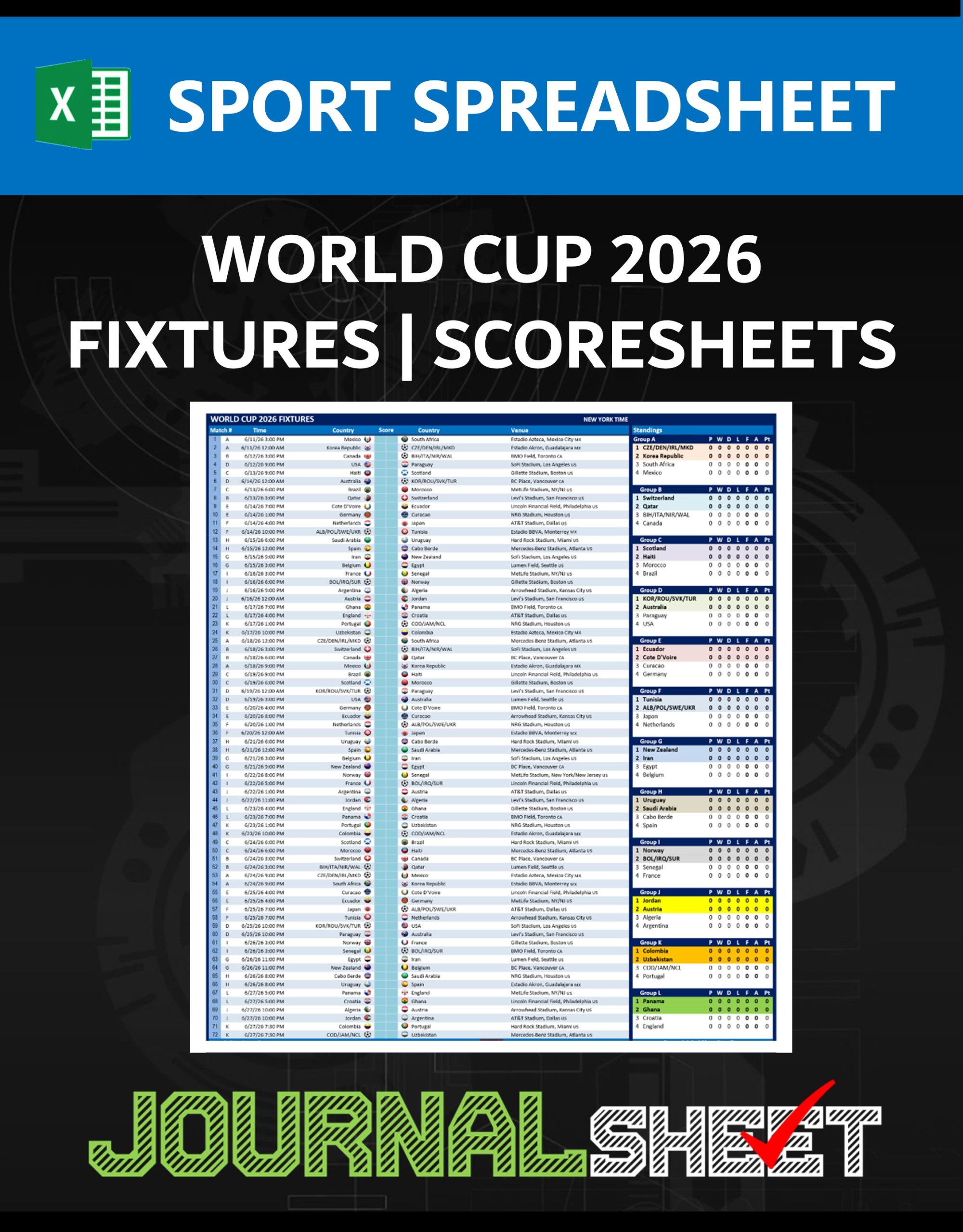 WORLD CUP 2026 FIXTURES | SCORESHEET is an Excel spreadsheet to see a full schedule of World Cup 2026 football final tournament matches that will be held in USA, Canada and Mexico this summer. You can use this spreadsheet as your scoresheet since it is equipped with formulas that will automate standings based on your scores.